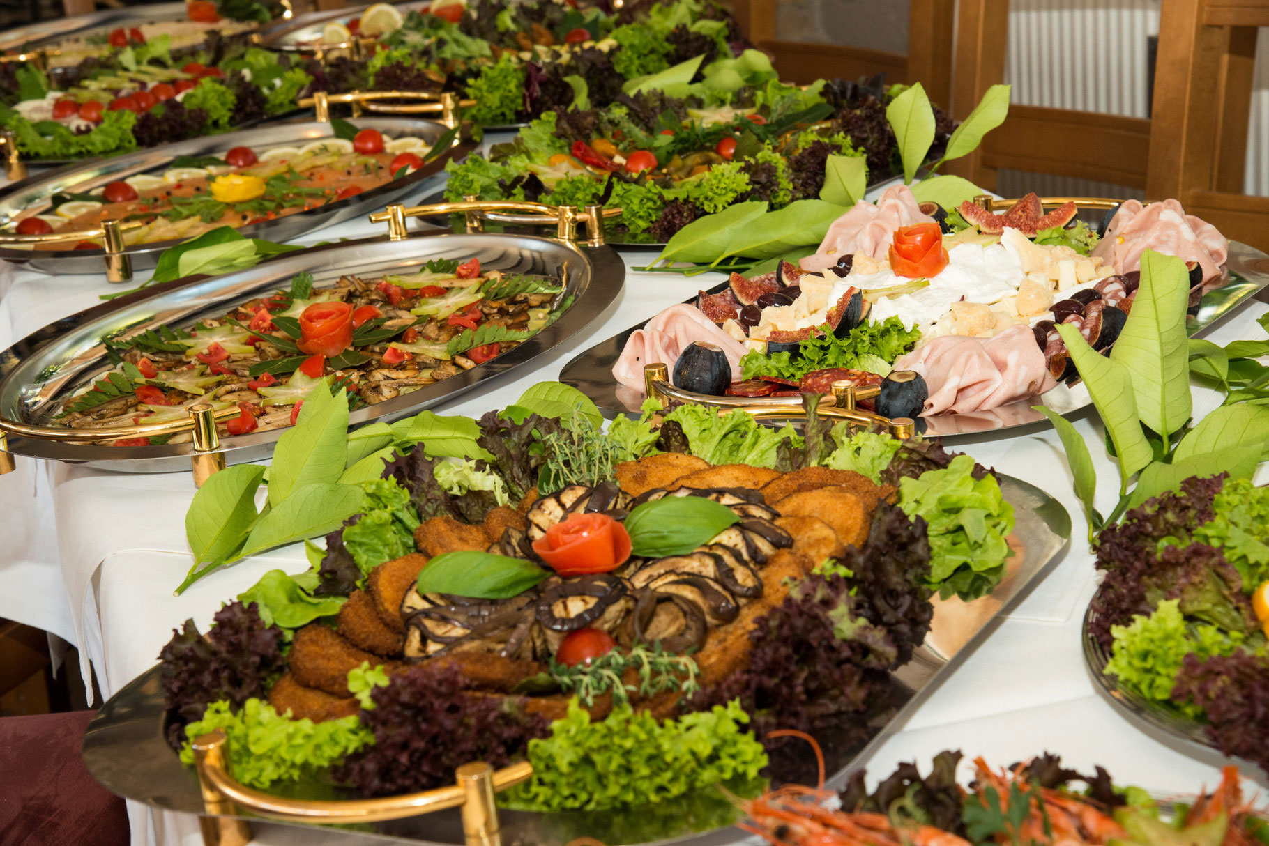Unsere vielfältige Speiseauswahl reicht kalten Antipasti-Platten über warme Köstlichkeiten bis hin zu Desserts und Obstarrangements.